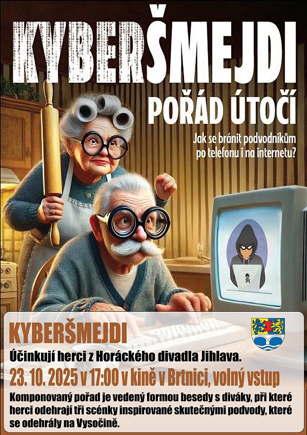 Podvodníci neustále mění své metody, ale jejich cíl zůstává stejný – připravit nás o peníze. Ať už jde o falešné telefonáty, podvodné e-maily nebo nebezpečné odkazy, ohrožen může být každý z nás. Jak takovým útokům čelit a poznat je včas? Odpovědi nabídne beseda „Kyberšmejdi pořád útočí“, kterou připravili herci Horáckého divadla Jihlava. | |